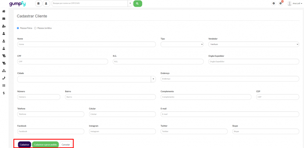- Ao abrir a tela de cadastro haverá as opções para preenchimento como pessoa física e jurídica, alterando apenas as opções de CPF e CNPJ.