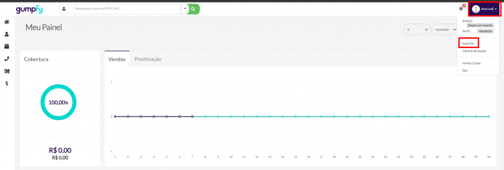 Para acessar o suporte, acesse o menu clicando em seu nome no canto superior direito da tela, após na opção “Suporte“, conforme imagem abaixo: