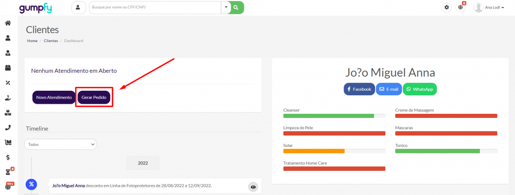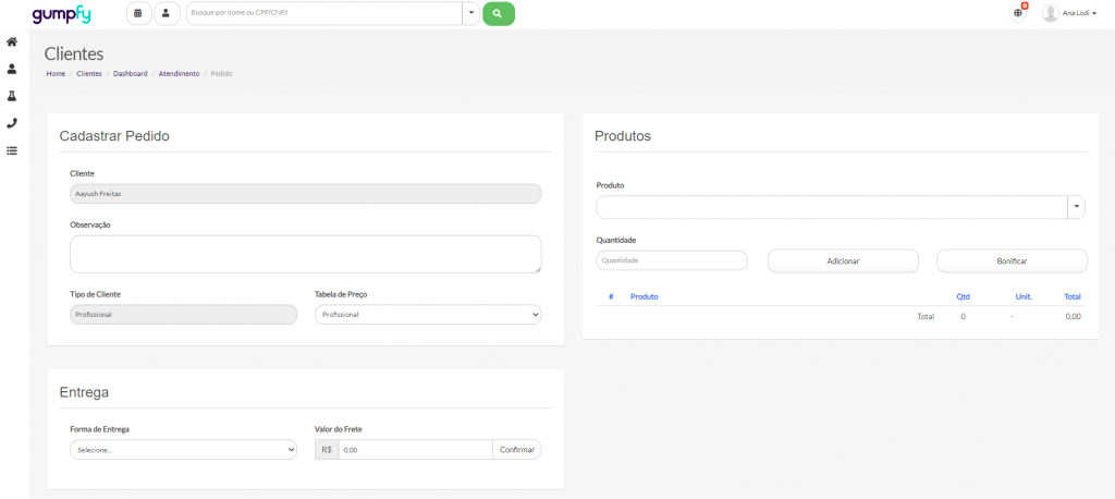 Para realizar um novo pedido, acessa o cadastro do cliente desejado e terá a opção de gerar um novo pedido: