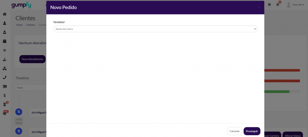 Ao clicar em novo pedido, caso este cliente já tenha um vendedor vinculado trará o nome do mesmo em uma nova janela e este poderá ser alterado. Após, irá abrir uma nova página com as informações necessárias como os produtos, entrega e pagamento.