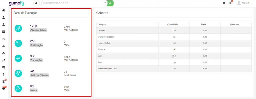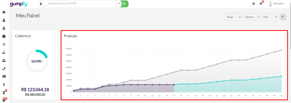 - Na cobertura é apresentado a percentagem atingida sobre a meta total do mês: